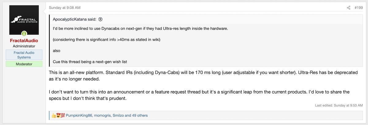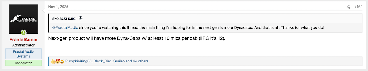 Other details were also shared regarding future hardware features, such as the evolution and enhancement of the Fractal Dynacabs (10 microphones and 170 ms IR length):