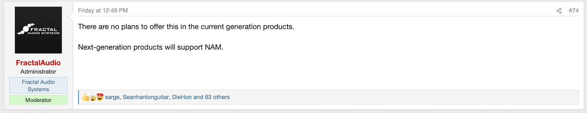 A message posted on October 31st by the official administrator of the Fractal Audio forum announces support for NAM (Neural Amp Modeler) for their next generation of hardware, in addition to the current features of Fractal hardware, which are based on modeling :